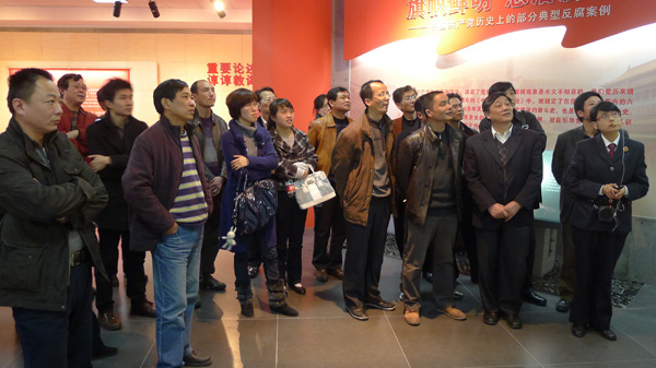 在省法纪教育基地,全体同志首先参观了“警钟长鸣”法纪教育图片展览。图片展示了近年来我省查处的多个领域的党员干部腐败案件,从信念动摇、心理失衡、独断专行、交友不慎、贪欲膨胀、道德滑坡、同流合污等八个方面深刻剖析了党员干部贪污腐败的根源,告诫大家要把住“权力关”、“交友关”、“亲情关”、“工程关”和“小节关”等“关口”。