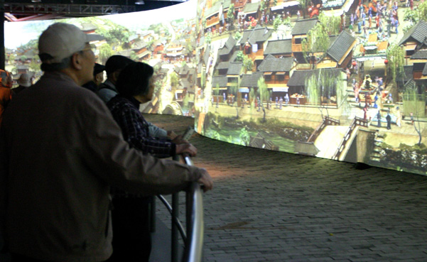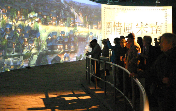 最让老干部们赞叹的还是位于三楼的“镇馆之宝”──三维动态版的《清明上河图》和《南宋风情图》。两幅巨作,总长200余米,将中国古人淡泊悠然的社会生活活灵活现地呈现出来。《清明上河图》中日夜更迭的都市场景、千余名动态人物、繁忙的汴河漕运、喧闹的街市,令老干部们叹为观止。《南宋杭城风情图》中,几千名穿戴别致、姿态万千的南宋市民,往来穿梭其间,状元游街、赛酒会、跑旱船、踩高跷、耍流星、舞蛮刀等南宋民间文化活动场景悠然如生,仿佛让老干部们穿越到了800年前的大宋朝代。面对此情此景,老同志们纷纷感叹现代科技发展的日新月异,让他们从新视角领略了中国传统文化的独特魅力。