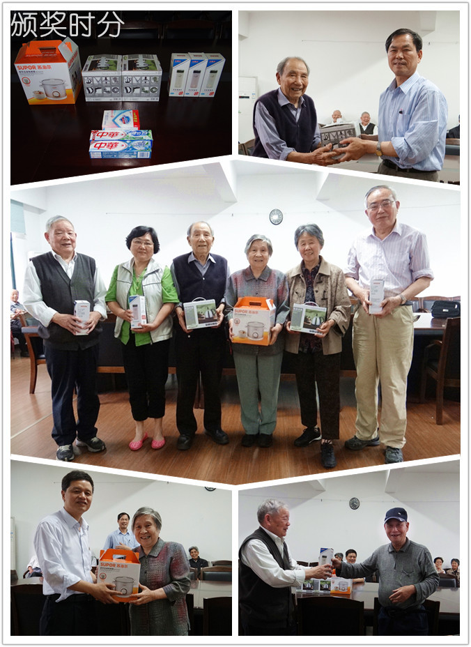 - 离休党工委副书记、华家池校区离退办主任王剑忠及老体协分会主席傅延兴等向获奖人员颁发了奖品并合影留念。