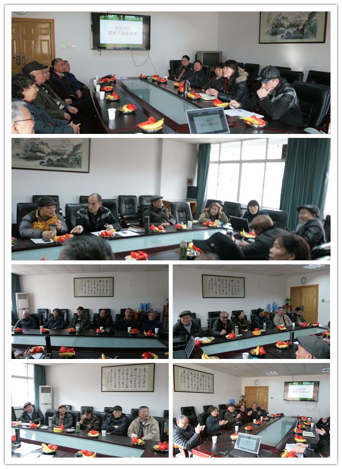 2015年1月14日和1月19日,玉泉校区离退休办公室在教工活动中心三楼会议室召开退休老同志座谈会。玉泉校区退休人员代表近20人参加了座谈会,代表覆盖了退休干部、工人和教师。离退休处常务副书记、副处长朱征同志,玉泉校区离退休办俞文胜主任和华军副主任参加座谈。