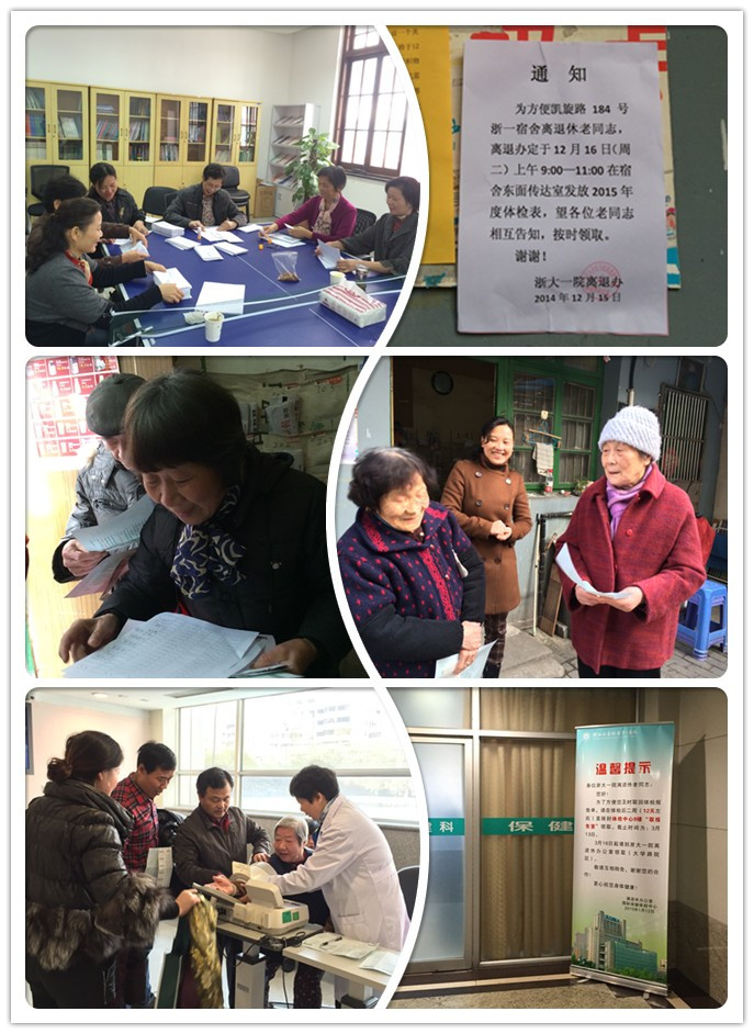 为保障老同志体检工作顺利进行,离退休办公室积极主动做好服务工作,陈剑秋主任为此进行了统筹安排:早在开始体检前施建勇主任就运用信息化手段,从老同志的信息库中一一调取邮编地址打印,并安排分装信封;针对老同志居住相对集中的社区,事先踩点,张贴通知,上门送体检通知单;对因故未及时体检的离退休老同志,逐一进行电话通知;同时积极与保健部、体检中心沟通,考虑到办公室搬至大学路院区,为方便老同志及时领取体检报告单,提前请外联办制作告示牌,分别放置在老同志常去配药的保健部、以及体检中心服务台;从体检的第一天开始,主任起早带队亲临体检现场,了解老同志的身体状况,询问检查情况,碰到问题现场解决,针对高龄、无子女陪同的老同志,做好陪同、协调工作。每每看到一大一小两陈的忙碌身影,为此还得到了老同志们的称赞,“陈”心“陈”意的美称随之而来。这也体现了离退办的一贯宗旨:诚心诚意为老同志服务;体检报告单出来之后,杜老师会第一时间通知体检中发现有可疑症状的离退休老同志,请他们做进一步检查……从元月5日到2月13日,短短30个工作日内共有818位老同志进行了体检及健康评估。