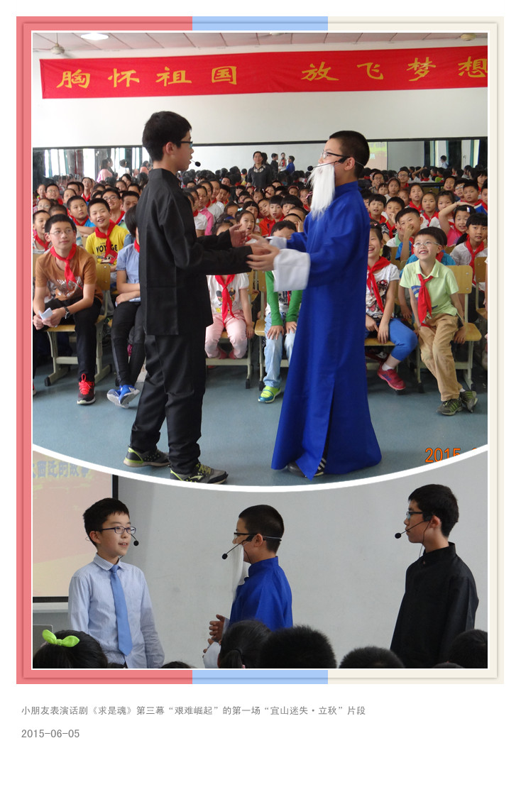 校园话剧《求是魂》第三幕“艰难崛起”的第一场“宜山迷失·立秋”片段,将活动推向高潮。少先队员们的精彩表演,感染了在座的每一位嘉宾、师生。求是精神将在少先队员们幼小的心灵里生根、发芽,茁壮成长!