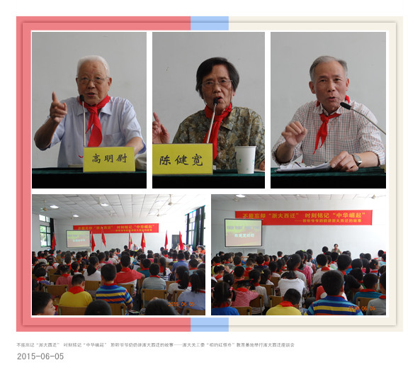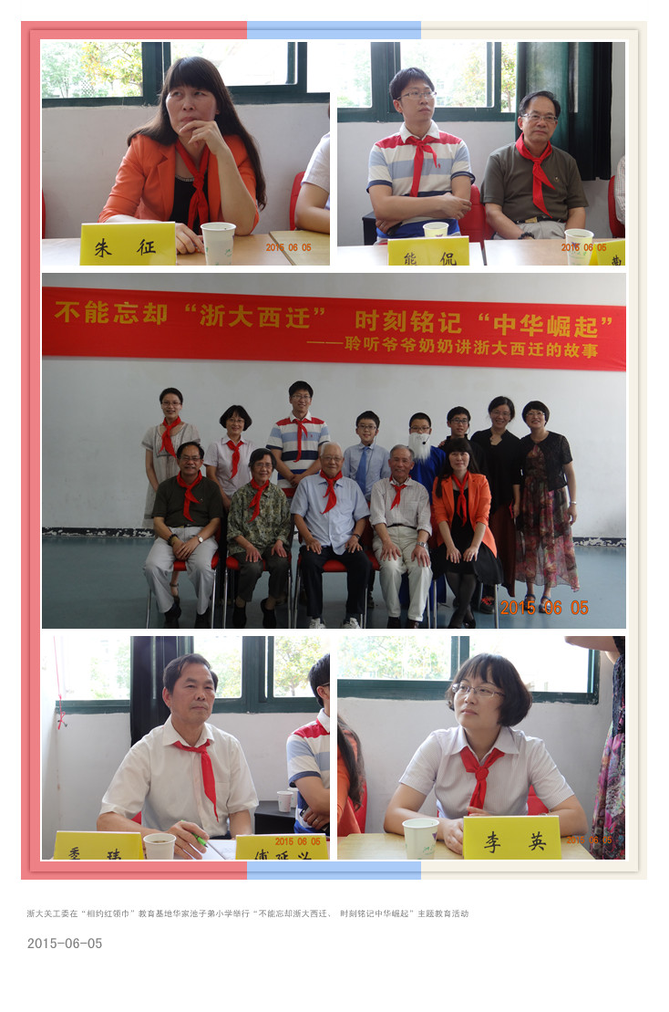 今年是浙江大学西迁办学76周年。2015年6月5日下午,浙大关工委“相约红领巾”教育基地华家池子弟小学举办了“不能忘却浙大西迁、时刻铭记中华崛起”主题教育活动,特别邀请高明尉、陈健宽、邹先定三位教授为全校师生讲浙大西迁的故事。离休党工委常务副书记、离退休工作处副处长、浙大关工委秘书长朱征,浙大关工委副主任曹列锋,浙大后勤集团关工委副主任傅延兴出席了活动。