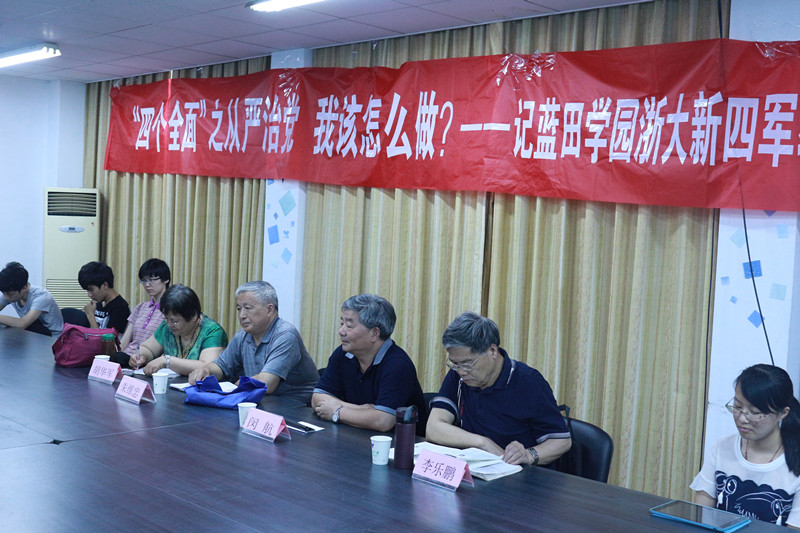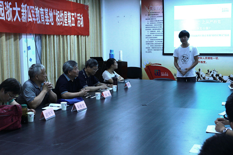 2015年6月5日下午,以“‘四个全面’之‘全面从严治党’——我该怎么做?”为主题的新四军教育基地“相约星期五”活动在蓝田六舍党员之家举行。应邀参加本次活动的有新四军研究会的朱维忠、胡华军和浙大关工委的李乐鹏、闵航四位老同志以及来自蓝田学园各个党支部的部分党员、入党积极分子及入党申请人等20余人。本次活动由张会轩同学主持。