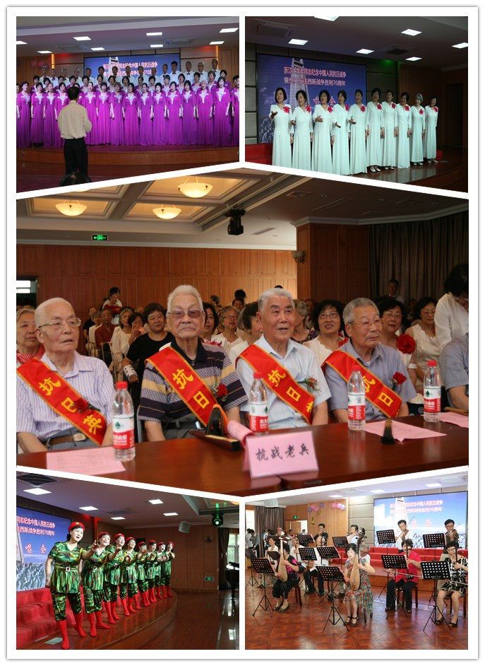 浙江大学老年合唱团、四校区老年合唱团及远道而来的德清老年大学艺术团,为大家呈献了一场精彩的演出。合唱《到敌人后方去》、《二月里来》、《在太行山上》、《五月的鲜花》,舞蹈《红高粱》,京剧《你待同志亲如一家》、器乐合奏《十送红军》等,一首首经典的抗战歌曲,表达了浙大老同志对党和祖国的热爱之情,引起了观众的阵阵共鸣,祝福我们的祖国繁荣富强,生生不息。