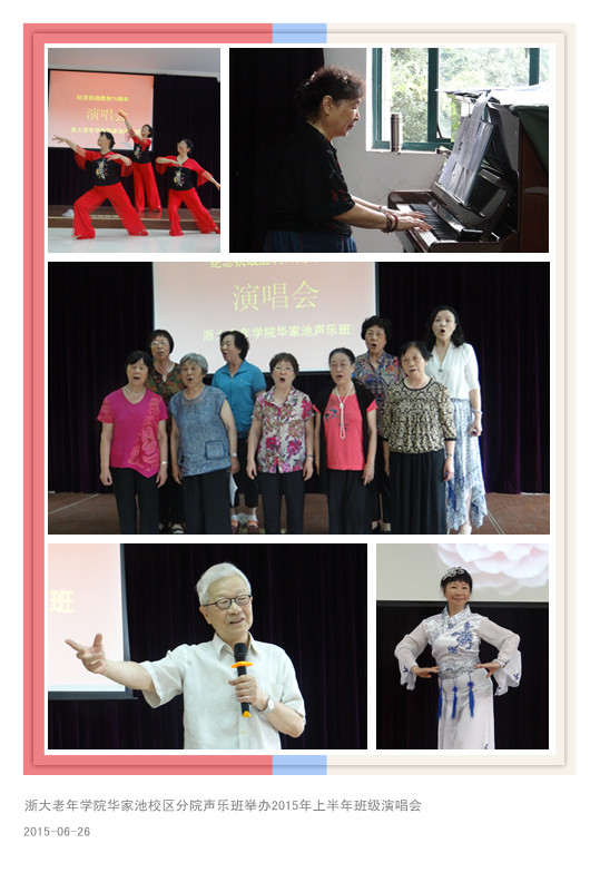 6月26日,华家池校区常青楼报告厅内歌声朗朗,婉转悠扬。在这里,浙江大学老年学院华家池校区分院声乐班为纪念抗日战争胜利70周年正举行2015年上半年的班级演唱会。