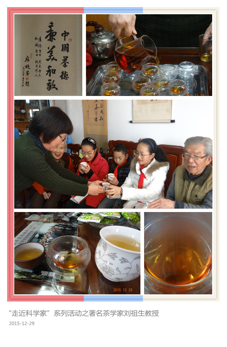 孩子们的到来,让刘祖生教授和家人特别高兴。一整个下午,刘教授和同为茶学专家的夫人胡月龄教授带着孩子们一边品茗、一边交流,亲切地回答学生们的问题。老先生引经据典、旁征博引,从茶的历史、茶的分类以及茶德、茶技、茶艺、茶道等多方面给大家上了生动而新鲜的一课。孩子们徜徉在茶文化丰厚广博的世界中感到神奇而幸福,纷纷表示:愿做一名小茶人,为弘扬中华民族灿烂的茶文化作出自己小小的贡献。