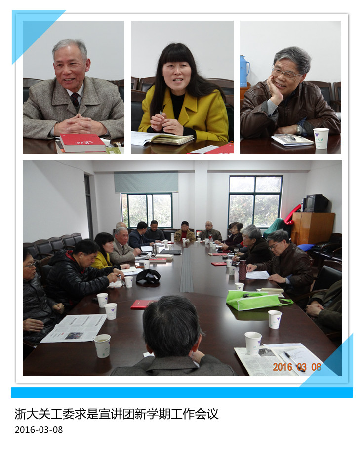 2016年3月8日上午,新一年的早春,华家池畔春雨霏霏、新绿溢溢,我校关心下一代工作委员会求是宣讲团新学年工作会议在华家池离退休办会议室隆重召开。全体团员济济一堂,会议由离休党工委常务副书记、离退休工作处副处长、校关工委秘书长朱征主持。