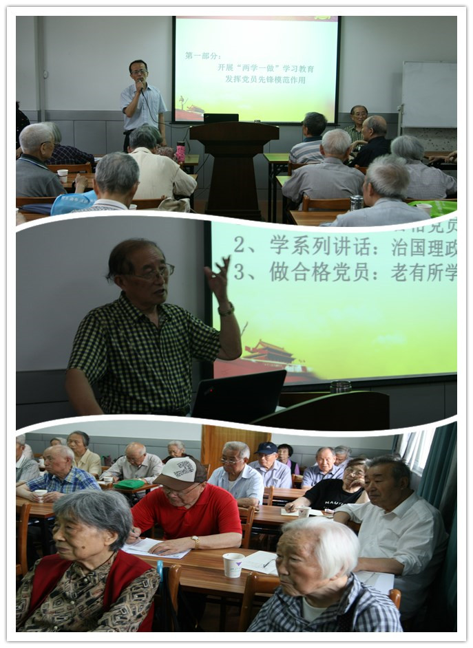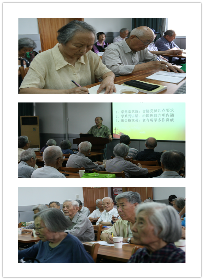 2016年6月16日上午9时整,在玉泉校区教工活动中心409教室,座无虚席,40位离休党员聚集在一起听校关工委求是宣讲团的郑元康教授作题为《开展“两学一做”学习教育发挥党员先锋模范作用》的专题辅导报告。离休党员接到总支通知后,都非常期待这场报告。有的由阿姨推着轮椅过来,有的由老伴陪同过来,有的一大早从城东坐公交车赶过来,坐在教室里认真听课认真记笔记。专题辅导报告会由玉泉校区离休党总书记韩东晖主持,离休党工委常务副书记朱征及处部分在职党员也一起听报告。