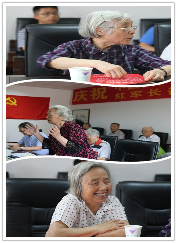 方舟说:没有党就没有今天的我,我要百分之百地鞭策自己,永远跟党走。陈全庆说:我们不能忘记那些抛头颅洒热血的先烈们,每位党员要经得起历史的考验。黄擎明说:我从农村孩子成长成为大学教授,都是党培养的结果。她在入党60年时写道“追寻大爱梦,矢志永不移。八十身尤健,情怀似旧时。”鲍天桂说:我非常怀念牺牲的战友,部队师长王吉文、原浙大老领导周荣鑫对他影响很大。榜样的力量是无穷的,要教育好子女,作阳光模范长辈。储静说:我是个穷孩子,很小就接受党的教育,要为党鞠躬尽瘁。77年党龄的张思麟动情地唱起《松花江上》:我的家在东北松花江上,那里有森林煤矿,还有那满山遍野的大豆高粱。。。。。。哪年,哪月,才能够回到我那可爱的故乡?哪年,哪月,才能够收回那无尽的宝藏?他说:落后就要挨打,没有共产党就没有新中国!