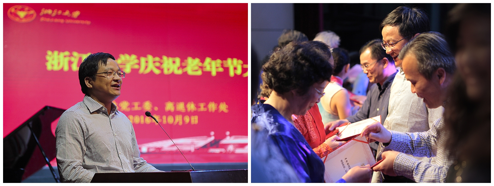 在庆祝大会上,学校对近两年以来积极参加省、市、区、街道及学校的各类老年文艺活动、积极向上、热心奉献、具有文艺特长的17位老年文艺工作先进个人进行表彰,同时对老年学院中成绩优良、能够很好地展示所学技能与个人风采的27位优秀学员进行表彰。胡旭阳副书记与校老干部工作领导小组成员单位的负责同志一起为获奖老同志颁奖。当98岁的郭本铁老人作为老年文艺工作先进个人在台上领奖时,大家热烈鼓掌。郭本铁老人酷爱京剧,曾荣获浙大老同志好声音最佳风采奖。我们无不为他这种老当益壮、活到老学到老的精神感动。