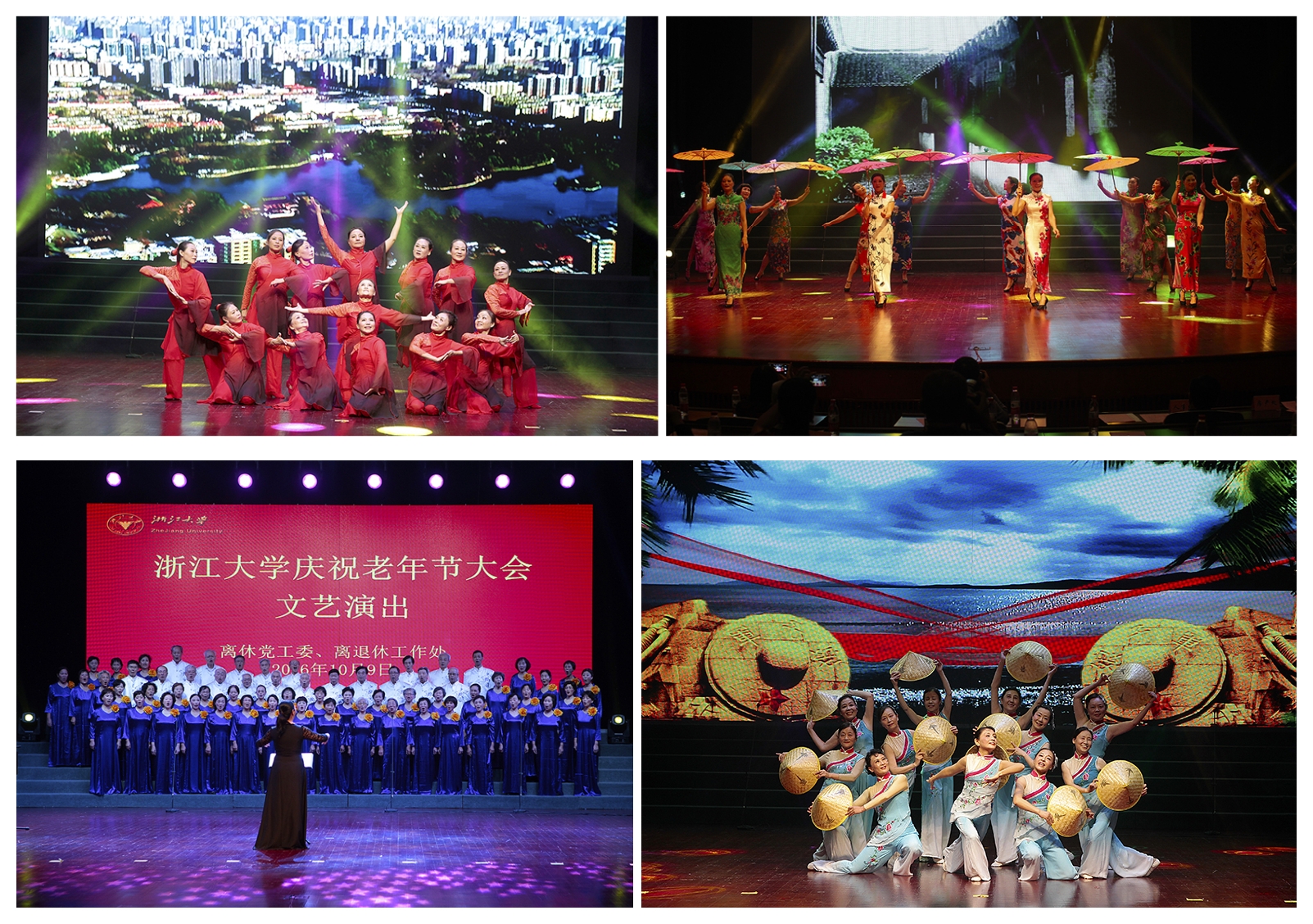 文艺演出在《浙江大学校歌》中拉开序幕。经过几个月的认真排练,各老年文艺团队给大家带来了一场视听觉的盛宴。校老年合唱团的混声合唱《十送红军》、《赋得古原草送别》、诗朗诵《雨巷》。玉泉校区的舞蹈《万泉河水》、时装表演《梨花颂》、合唱《送别》和《飞来的花瓣》,西溪校区的舞蹈《山丹丹开花红艳艳》、合唱《蝶恋花》、《青海湖之恋》,华家池校区的舞蹈《天天好心情》、合唱《儿行千里》和《南湖红船》,湖滨校区的舞蹈《国风》、京剧联唱《行云流水》,赢得在场观众的阵阵掌声。这次演出还特邀了德清老年大学金秋艺术团和舟山普陀区旗袍队,他们分别带来了戏曲联唱和服饰表演《江南雨》,给观众留下了难忘的印象。