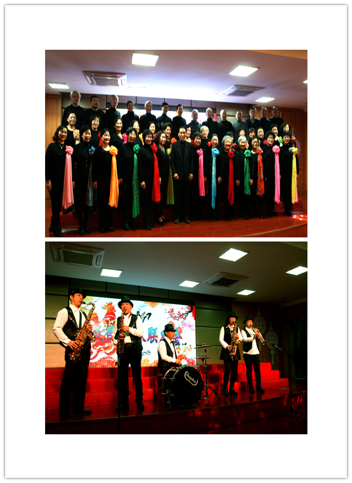 五个合唱团的团员们喜气洋洋地欢聚一堂,辞旧迎新,告别2016年,迎接2017年的到来。每个团都拿出自己最出采的节目进行交流演出,整个会场笑声掌声不断。