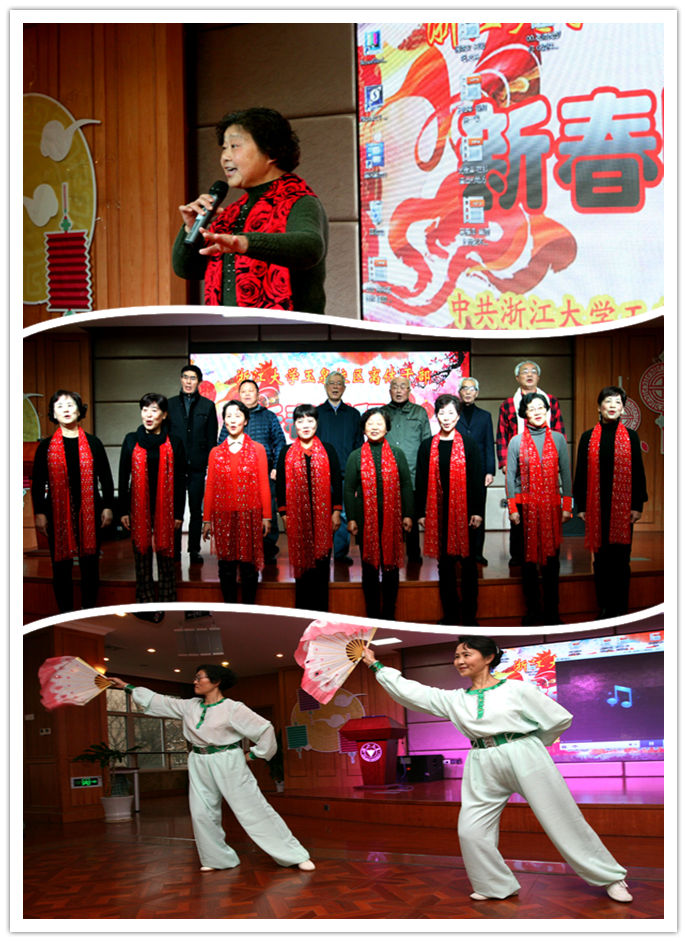 合唱《浙江大学校歌》、《打靶归来》,女声二重唱《美丽的紫金港我的家》、还有胡肖枫的独唱《芦花》、陶铁民的独唱《老师我想你》,平培芳、谢杭丽的木兰扇舞。忻学英的京剧歌曲《梨花颂》,唐瑞珠的京剧《霸王别姬》选段等。原玉泉校区离休党总支部书记卢绍宽也客串朗诵了毛泽东的诗词《沁园春·雪》。50余位离休干部看得津津有味,掌声不断。
