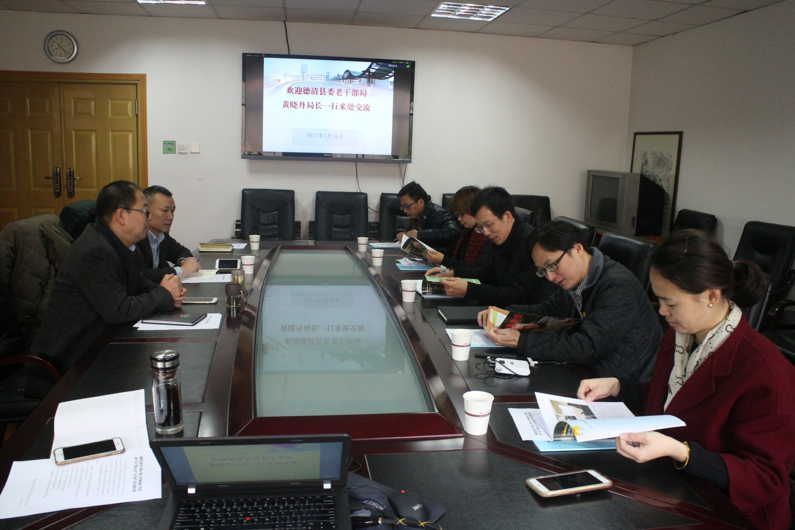 3月16日上午,德清县委老干部局局长黄晓丹,副局长姚伟红一行5人来我处商讨2017年度合作交流计划。处领导王庆文、李民同志参加会议。