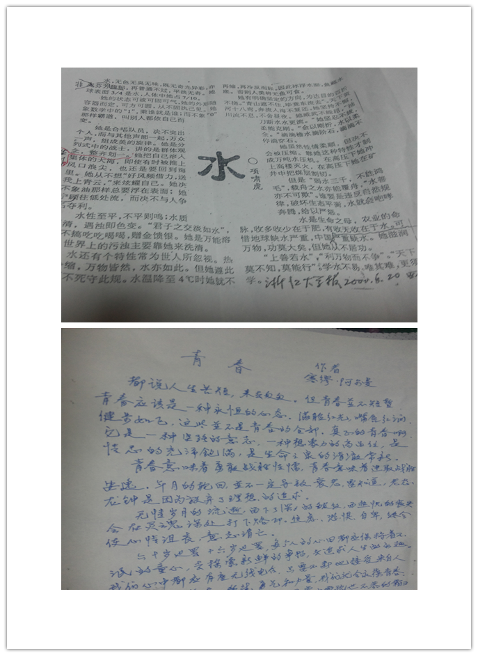 86岁离休干部项啸虎带来了他2000年6月20日发表于浙江大学报上的一篇散文《水》,他将水比作合唱队员,“决不突出个人,而与其他声部一起,万众一声,组成美的旋律。”他语重心长地说:水是生命之母,我们要爱水、珍惜水!