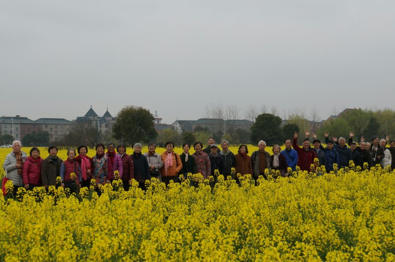 随后我们来到了湘湖三期花田,这里是一望无际的油菜田,金色的油菜花正竞相怒放,一片金色的海洋,大家纷纷拍照留念。都是退休老同事,大家来到这里做到与自然界的充分融合,陶冶情操、天人合一,活动筋骨、通畅气脉、调节机体功能对延缓衰老、强身健体确实大有裨益。