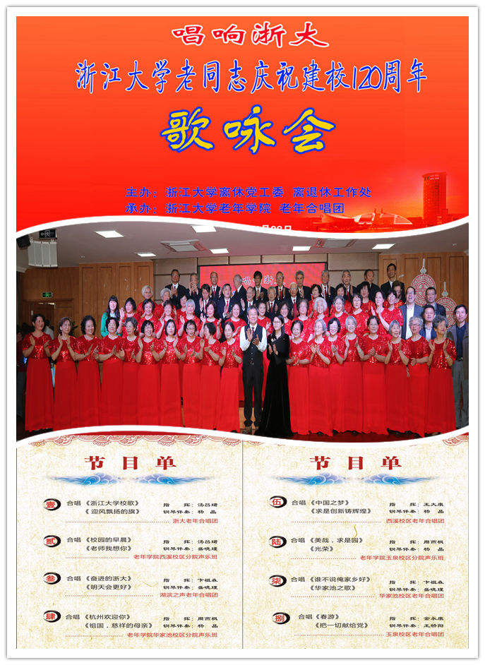 2017年4月27日下午2时整,在浙江大学校庆日倒计时24天之际,由浙江大学离休党工委、离退休工作处主办,浙江大学老年学院、老年合唱团承办的“唱响浙大”浙江大学老同志庆祝建120周年歌咏会在玉泉校区教工活动中心二楼多功能厅隆重举行。