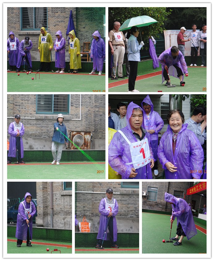 人造草坪门球场设施齐全、红绿分明、清爽美观,场地上的运动员们手握重槌气定神闲,挥杆对垒沉着冷静,不断地运筹、估测、瞄准,这既是一场体能的竞技,也是一次脑力的角逐,每一次弯腰击球的方向与力度都牵动着整场比赛的走势,需要队友之间保持默契的战术配合。比赛第三天的清晨,我校二队身着淡紫色雨衣在蒙蒙春雨中认真参赛,雨水打湿了门球场却打不湿队员们昂扬的作战精神,雨幕中激战正酣。