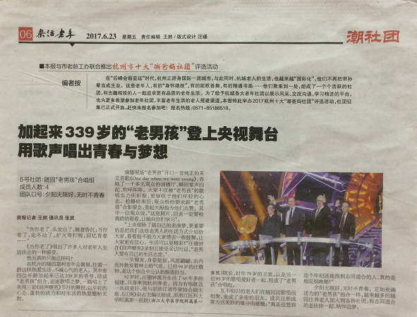 不久前,由我校原医学院附属第一医院院长、时年79岁的王竞老同志,同其他三位老同志,组成“老男孩”组合,登上了央视三套《回声嘹亮》节目的舞台,四位加起来已达339岁的老爷爷,在央视的舞台上,以一首纯正的英文老歌《One day when we were young》,博得了现场观众的阵阵喝彩,掌声不断。观众为他们精湛的歌唱实力所折服,纷纷合影留念。“老男孩”组合以年轻的心态、蓬勃的活力和对生活的热爱,获得了社会的广泛关注。“老男孩”组合的四个人本来互不相识,因歌唱而结缘,变成了亲密无间的好友。正如他们所说:“上央视除了圆自己的表演梦,更重要的是把我们这些老男人的生活方式介绍给大家,看看能不能为大家带去一些鼓舞,让大家更有信心,生活可以更精彩!”