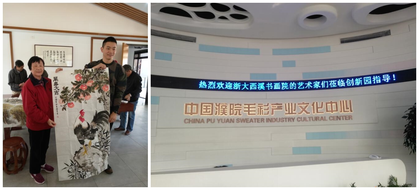10月27日,浙大西溪书画院一行二十余人前往桐乡濮院羊毛杉市场创业创新园进行交流活动。桐乡濮院羊毛衫市场是全国最大的羊毛衫市场;其创业创新园聚集了桐乡全市的羊毛衫企业,开发出全新优质羊毛衫产品,销往国内外。创业创新园还建设了文化创作交流场所,设有书画创作和展示场地。这次我们也向该园区赠送了十余幅书画作品,进行了交流,增进了相互了解和友谊。