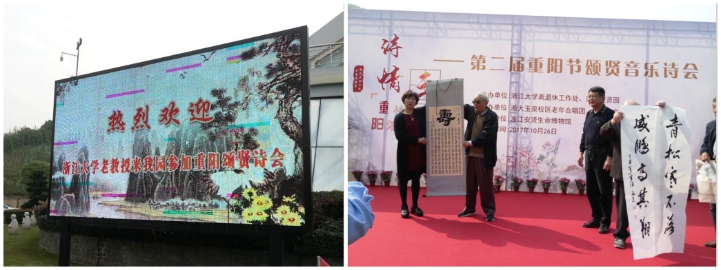 10月26日,一大早我们就乘车前往位于半山北坡的安贤园有限服务公司。此场活动是浙大离退休处和浙江安贤园共同举办的第二届重阳节颂贤音乐诗会;主要有玉泉校区老年合唱团、玉泉校区声乐班和安贤园职工唱主角;其中朗诵毛主席诗词“采桑子. 重阳”博得到场观众的热烈喝彩。浙大西溪书画院积�参与了该项活动,书画家们当场挥毫泼墨,还有十余位同志向安贤园献出了十余幅书画佳作;这些作品颂�了生命的可贵和秋的韵律。