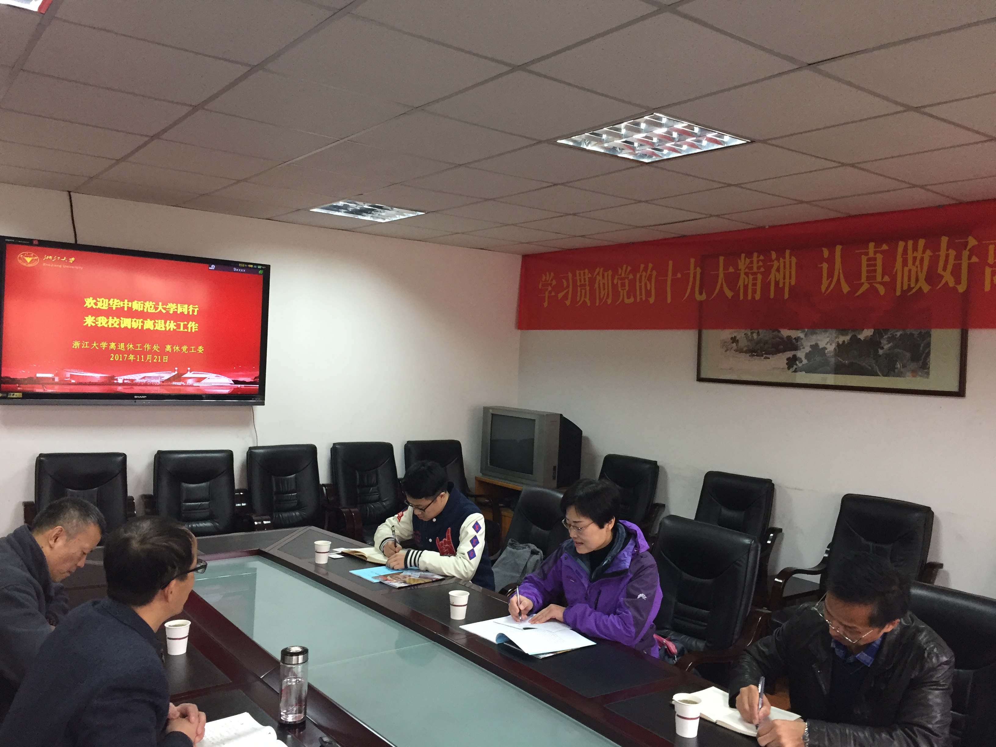 11月21日,华中师范大学离退休工作处纪红处长一行来我处考察访问,与朱征、韩东晖、李民等处领导座谈,就学习贯彻党的十九大精神,认真做好新时代离退休各项工作进行了交流。