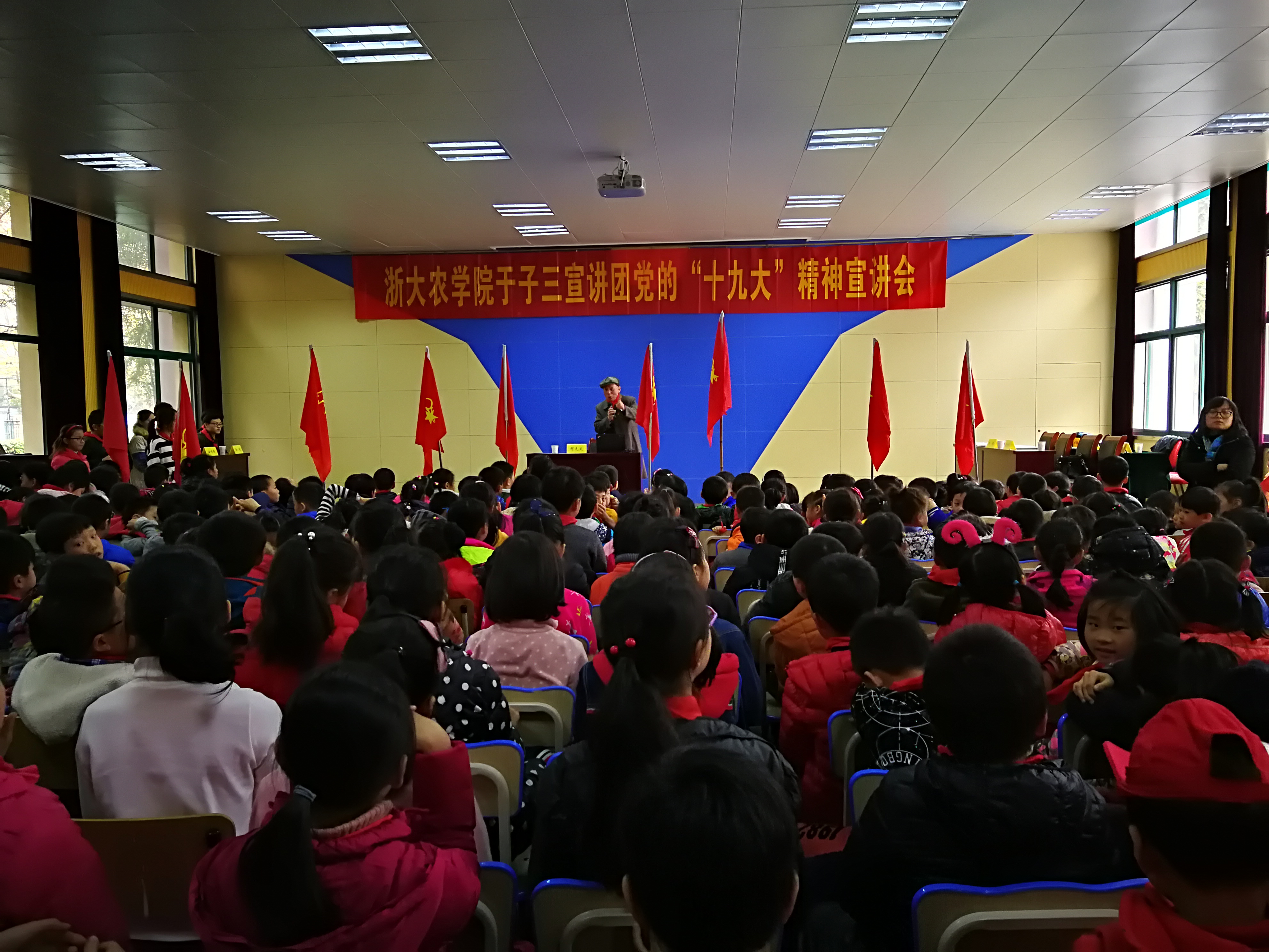 2017年12月1日下午,浙大农学院于子三宣讲团党的“十九大”精神宣讲会在华家池子弟小学举行。本次活动由浙江大学关工委“相约红领巾”教育基地与华家池子弟小学联合举办。浙江大学关工委顾问、求是宣讲团团长邹先定,关工委副主任曹列锋,离退休党工委常务副书记、离退休工作处副处长、关工委秘书长朱征等领导出席了本次活动。