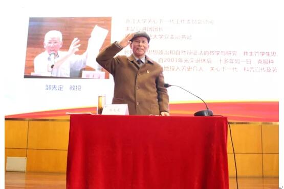 启动仪式的最后,邹先定教授代表老同志发言。他说,我们宣讲团老党员热爱党、热爱社会主义,同党中央保持高度一致。他们有着丰富的工作阅历和关心下一代工作的热情。他们中有一大代表王尽美同志的嫡孙王明华教授、有在刘伯承元帅身边工作多年的已年届87岁的项啸虎同志、有从事马列主义教育数十年的郑元康教授,还有力学专家庄表中教授,化学专家曾担任过高校领导的张孙玮教授等。我们希望通过建立“在鲜红的党旗下”活动平台,发挥老同志的配合补充作用,为宣传党的十九大精神,学校立德树人做一点力所能及的工作,让学生党员明白朴素的道理,在党言党、在党信党,在党为党、在党爱党。坚定理想信念,为中华民族伟大复兴为奋斗。
