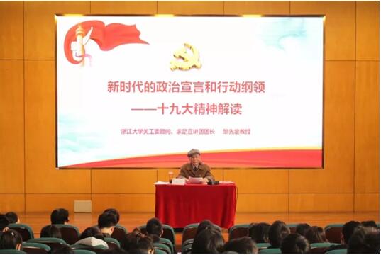 青年兴则国家兴,青年强则国家强。青年一代的理想、本领和担当,需要老一辈同志的引领和教导。12月10日上午,浙江大学“在鲜红的党旗下”活动平台启动仪式暨医学院“先锋学子”全员培训十九大专题讲座在紫金港校区医学院辅楼报告厅举行。浙江大学关工委顾问、求是宣讲团团长、原浙江农业大学党委副书记邹先定,党委学生工作部部长邬小撑,离休党工委常务副书记、离退休工作处副处长、校关工委秘书长朱征,以及关工委、求是宣讲团、平台对接院系的领导和老师们,以及医学院“先锋学子”培训班学生等300余人出席了活动。会议由医学院党委副书记陈周闻主持。