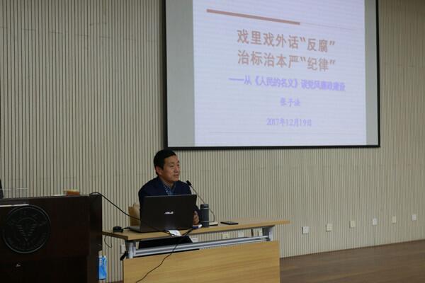 接着,经济学院党委书记、浙江大学校纪委原副书记张子法教授做了题为《十九大精神学习之廉政建设》精彩报告。张教授从今年热播反腐大剧《人民的名义》出发,剖析当代党风廉政建设,戏里戏外话反腐,治标治本严纪律。张教授从七个问题出发。一是如何认识“腐败严峻复杂”;二是大可不必“灰心丧气”;三是“亮剑”:治标为治本赢得时间;四是如何回答“李达康之问”?如何破题“易学习之困”;五是怎么用好管好“李达康”式干部;六是检察院反贪局的“收官”之作;七是全面从严治党“四梁八柱”性质的制度体系基本形成。从问题引发思考,并给出了解答策略。一是坚定理想信念;二是坚持党的基本路线;三是坚决维护党中央权威;四是严肃党的政治纪律;五是保持党同人民群众的血肉联系;六是坚持民主集中制;七是发扬党内民主和保障党员权利;八是坚持正确选人用人导向;九是严格党的组织生活制度;十是开展批评和自我批评;十一是加强对权力运行的制约和监督图片;十二是保持清正廉洁的政治本色。张教授总结到六有,对全院学生党员提出期望,“眼”中有方向,“心”中有情怀,“脑”中有思路,“肩”上有担当,“手”中有方法,“脚”下有底线。