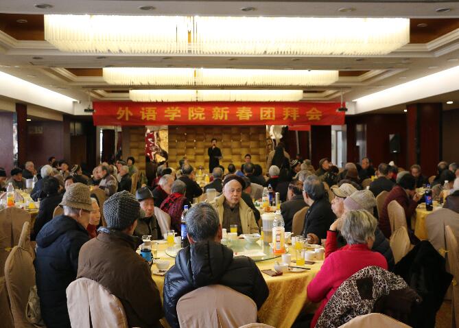 团拜会由院党委书记、副院长褚超孚主持。他首先代表学院对出席团拜会的所有离退休老师表示最热烈的欢迎和最衷心的祝愿,同时通报了学院离退休老师的基本情况,85岁高龄以上的老教师就有43人。2018年是外语学院建院90周年。褚超孚书记向到场的各位离退休老师们介绍了即将开展的院史资料收集编撰工作。学院将从3月开始开展“寻最美记忆、讲外院故事”系列活动,充分挖掘院史资料和素材,希望得到全体离退休老师、在职老师、广大校友和学生的积极支持。