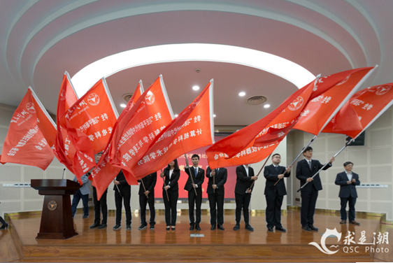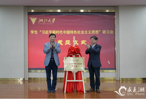 郑强和薛晓飞共同为浙江大学学生研习会揭牌,并为学生研习会分会授旗。