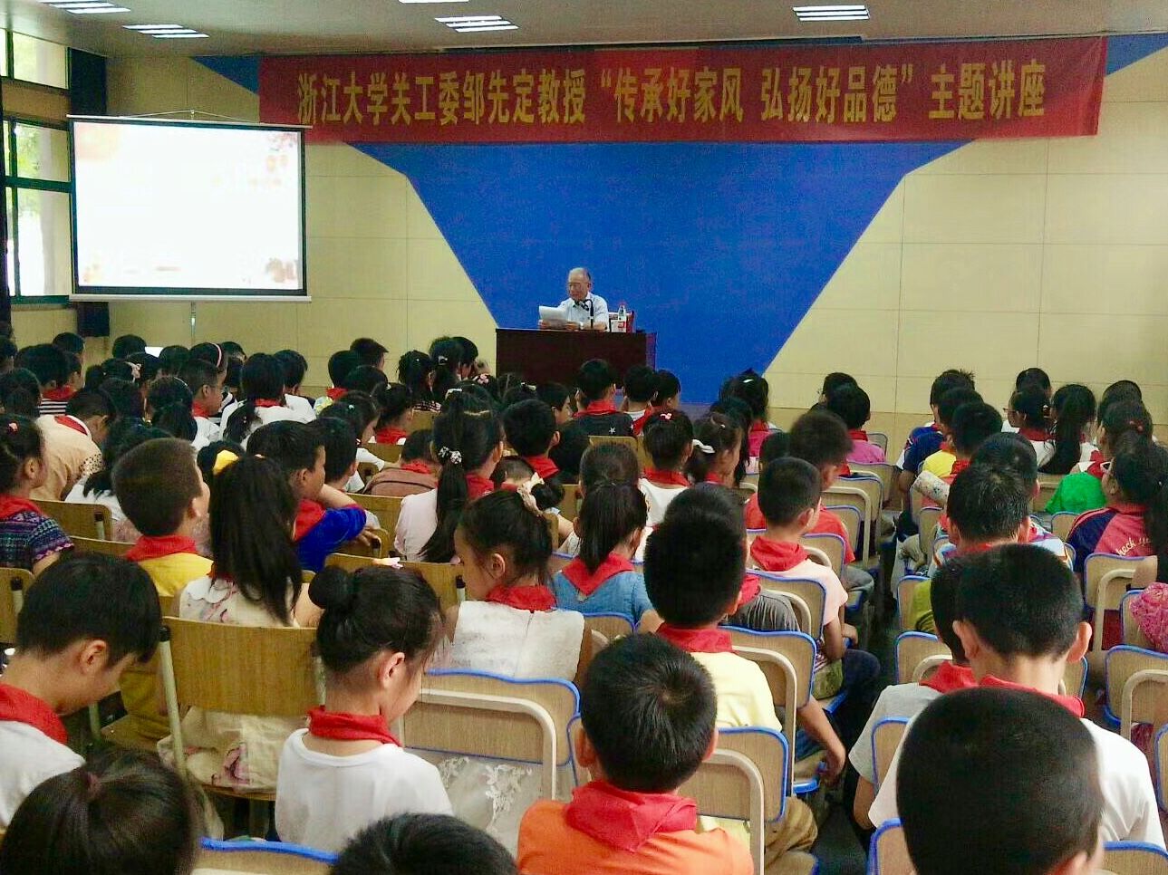 为弘扬中华优秀传统文化,传播社会主义核心价值理念,挖掘传统文化和良好家风,关心下一代健康成长,传播向上向善的正能量。5月18日下午,浙江大学关工委、后勤集团关工委和华家池子弟小学联合举办“传承好家风,弘扬好品德” 主题讲座。该讲座由浙江大学关工委顾问、求是宣讲团团长邹先定教授主讲,浙江大学关工委秘书、离退休工作处副处长朱征和华家池子弟小学全体师生共同出席本次活动。