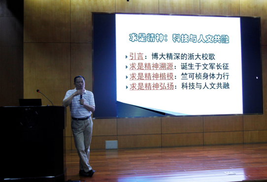 仪式结束后,第一场报告开始,许为民老师作了题为《求是精神:科技与人文共融》的主题报告。许老师结合十九大报告内容,从“浙大使命、大学学问、浙大精神”三个角度解读了浙江大学校歌,再从求是精神的“溯源、楷模和弘扬”三个维度讲述了浙大文军长征及竺老校长的感人事迹。许老师将求是精神与实事求是思想路线相结合,指出“知识、方法、智慧”是学习的三个层次,“技术、艺术、道术”是管理的三个层次,每位同学应打造个人核心竞争力,将人文价值理性和科学工具理性相融合。许老师平易近人、亲切和蔼的讲述方式,让在场师生党员深受感染。
