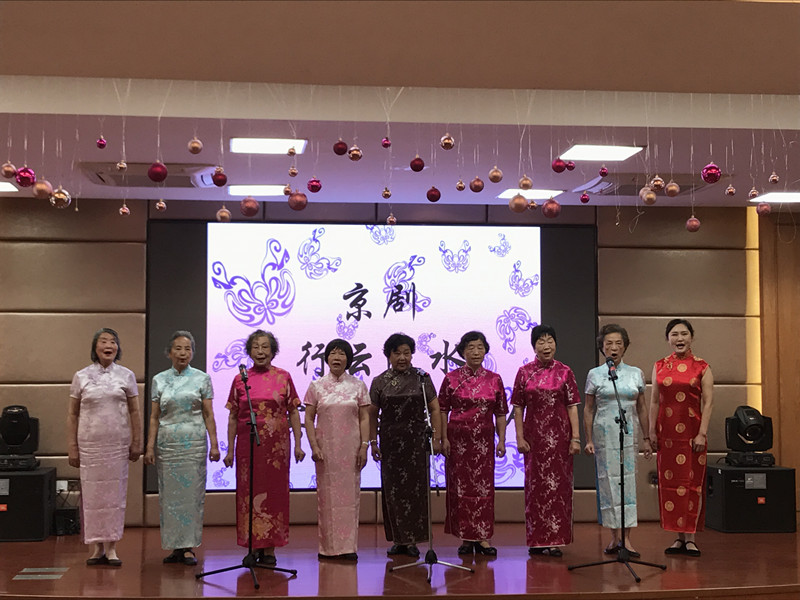 9位老同志身穿旗袍演绎了京剧联唱《行云流水》,为本场演出开启序幕。越剧《唱支山歌给党听》、京剧《江姐》选段《绣红旗》,唱出了老同志对党的恩情和永远跟党走的决心。越剧《书院情深》,将时光带回到了当年的青葱岁月。