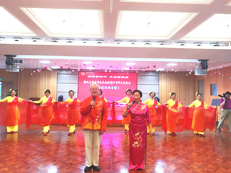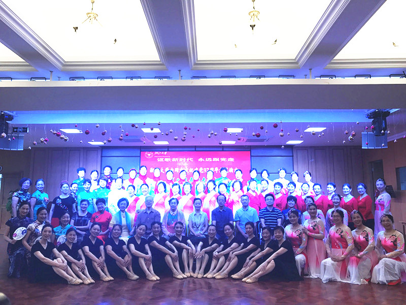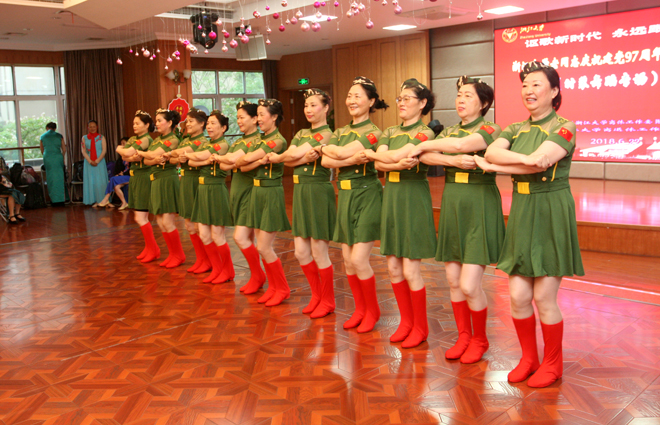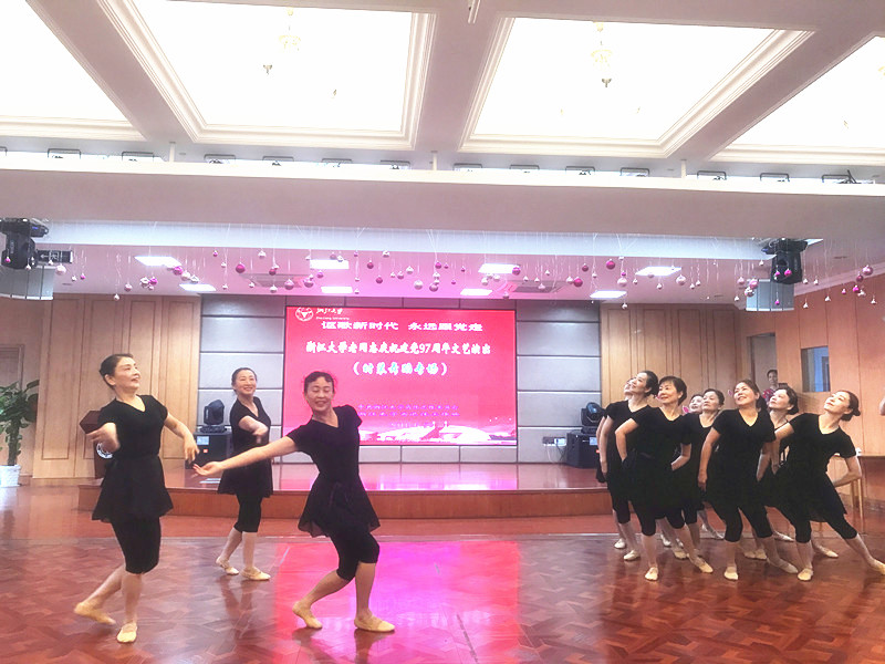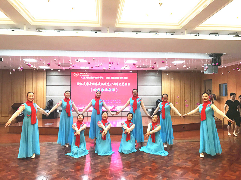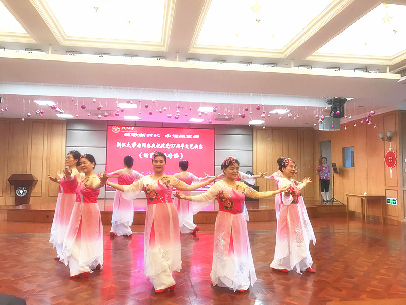 6月22日上午9时,“讴歌新时代 永远跟党走”浙大老同志庆祝建党97周年文艺演出(舞蹈时装专场)在玉泉校区教工活动中心二楼多功能厅举行。在常青腰鼓队热烈欢快的鼓声后,各老年舞蹈队和时装队呈现了9个精彩节目来庆祝党的97周岁生日。