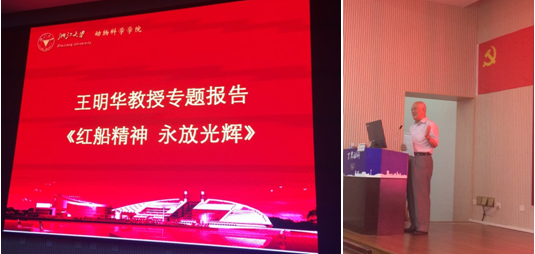 随后,浙江大学信息与电子工程学院王明华教授作了“红船精神永放光辉”的专题报告。王明华教授的祖父是中国共产党的创始人之一、山东党组织最早的组织者和领导者——王尽美烈士。王教授1974年入党,2003年和2016年两度被评为浙江大学优秀共产党员。退休以后,一直投身于学校关心下一代的有关工作,是浙江大学关工委宣讲团成员,长期致力于青年学生的理想信念教育和爱国主义教育。