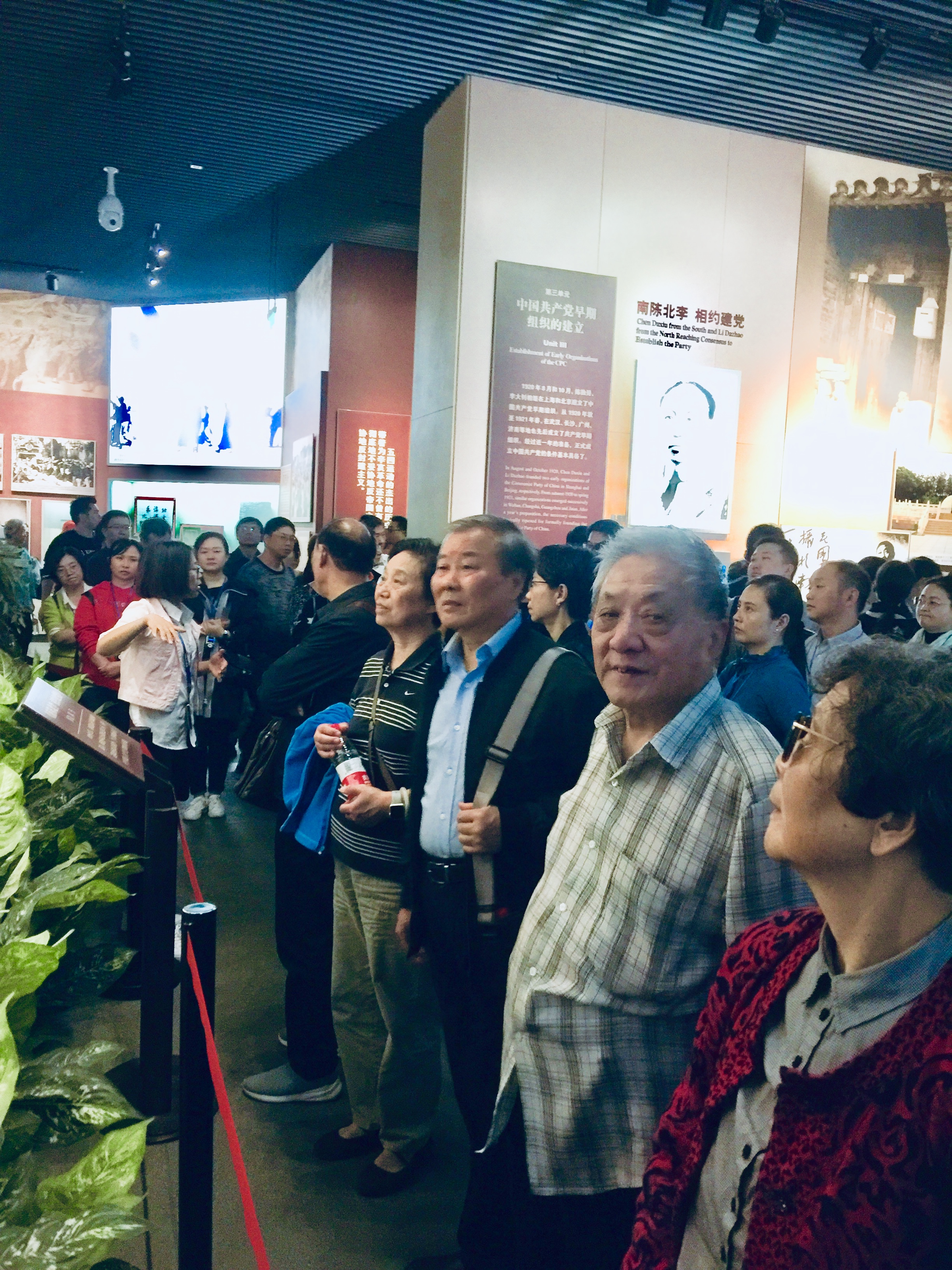 1991年扩建后的纪念馆整体建筑既体现庄重大气的风格,又融合江南文化元素。展出分“开天辟地”“辉煌历程”二大部分,内容非常丰富,彩色浮雕十分震憾。纪念馆前我们合影留念,展版前我们驻足细看,红船旁边我们与党旗在一起,“中国革命航船从嘉兴南湖扬帆起航……”