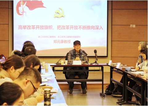 12月8日上午,浙江大学“在鲜红的党旗下”平台活动暨医学院“先锋学子”全员培训之改革开放40周年专题讲座在紫金港校区医学院综合楼705举行。本次讲座由浙江大学关工委顾问、求是宣讲团成员郑元康教授主讲,浙江大学关工委副主任、求是宣讲团成员薛金增老师,求是宣讲团成员张小玲老师,以及浙江大学医学院党委副书记陈周闻,浙江大学医学院辅导员刘傲然等出席活动。浙江大学医学院70余名学生党员参加了本次专题学习。