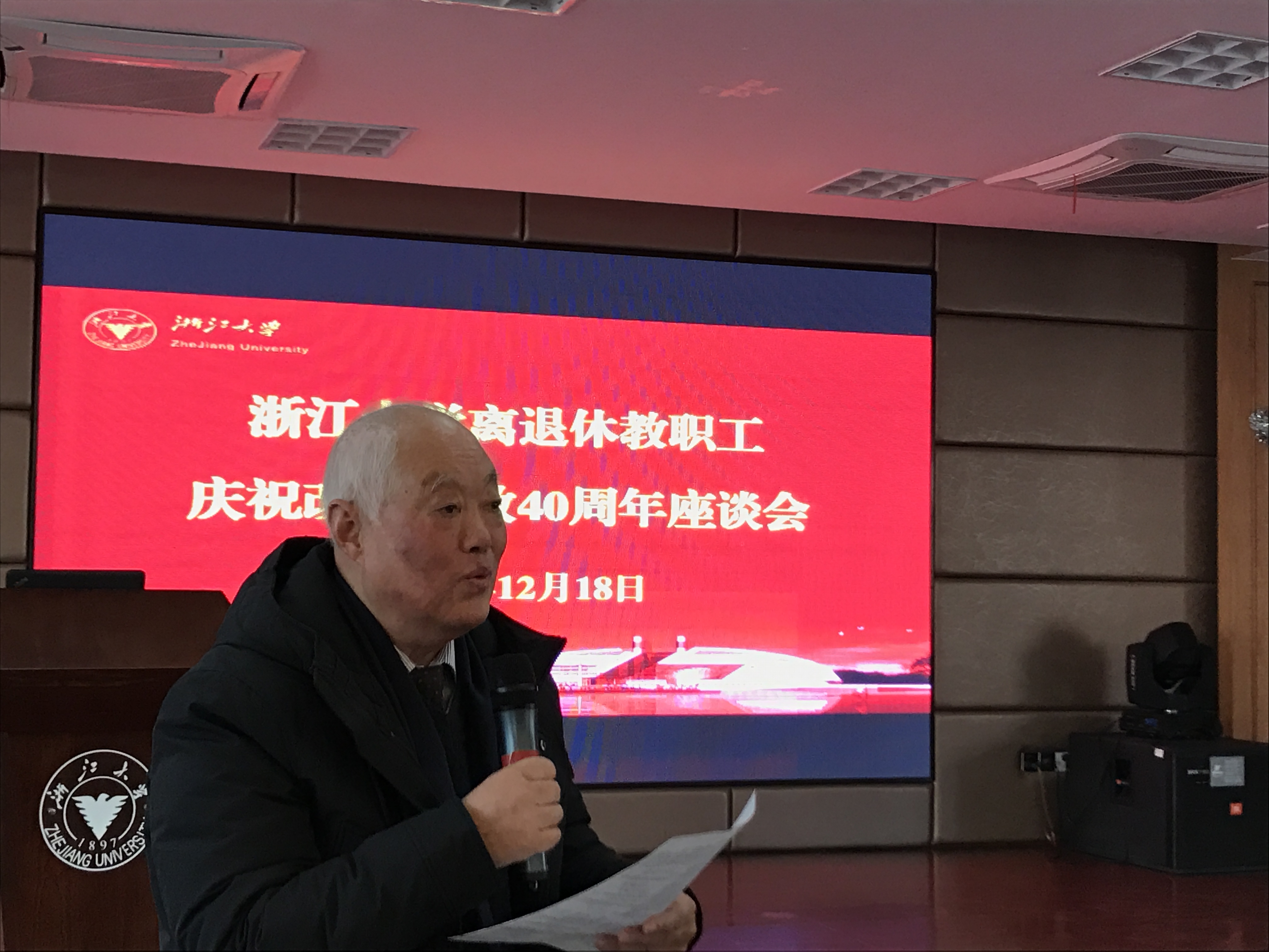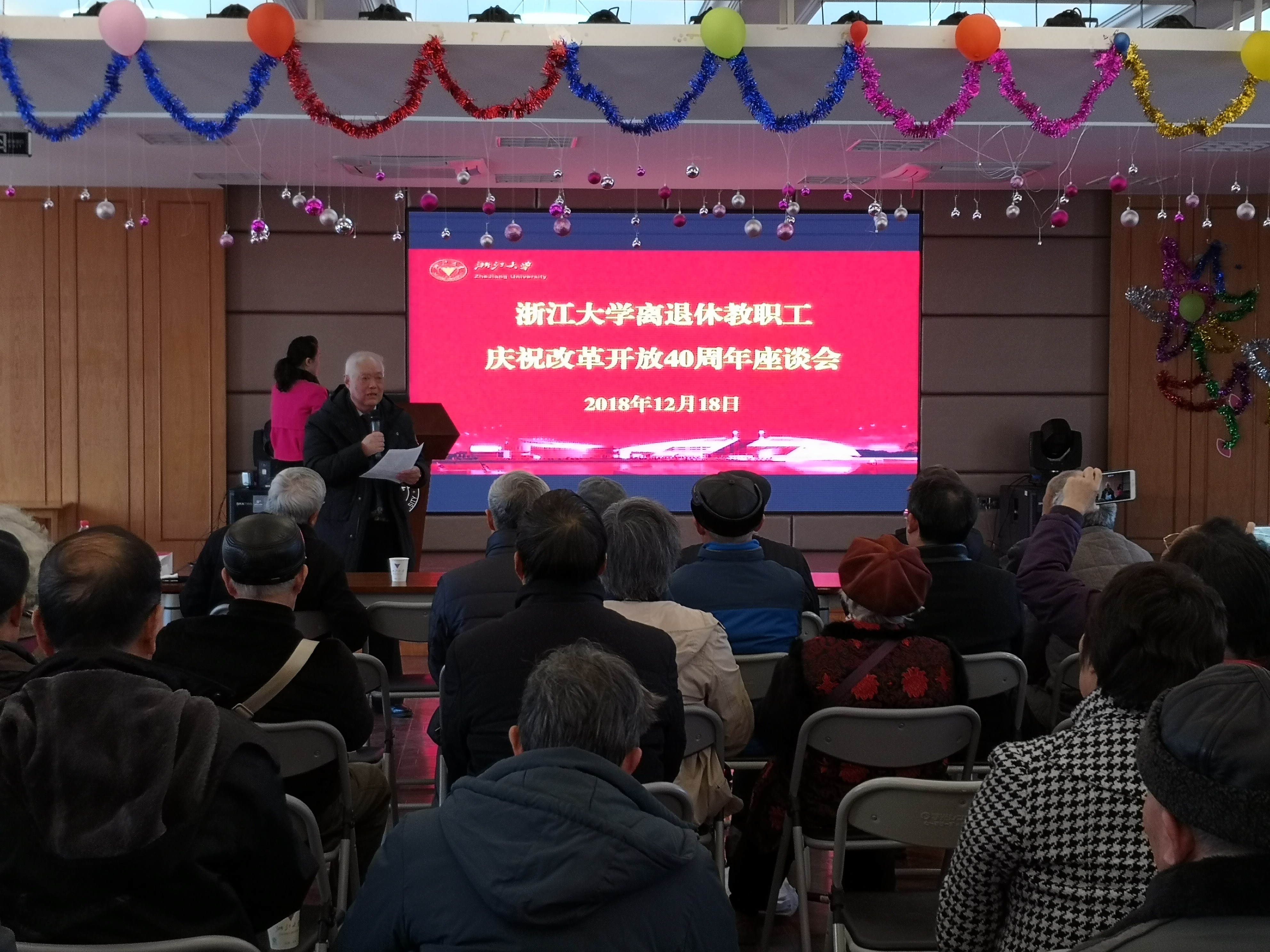 12月18日上午10时,庆祝改革开放40周年大会在人民大会堂隆重举行。浙江大学离休党工委、离退休工作处组织离退休教职工观看大会直播,共同聆听习近平总书记发表的重要讲话,会后召开座谈会,参会人员有离休干部、关心下一代工作委员会、退休党支部、老年学院、老年体协、老年文艺团队、为老服务团队的骨干代表以及离退休工作处工作人员等100多人,离退休工作处处长兼离休党工委书记王东参加座谈会,离休党工委常务副书记兼离退休工作处副处长朱征主持会议。