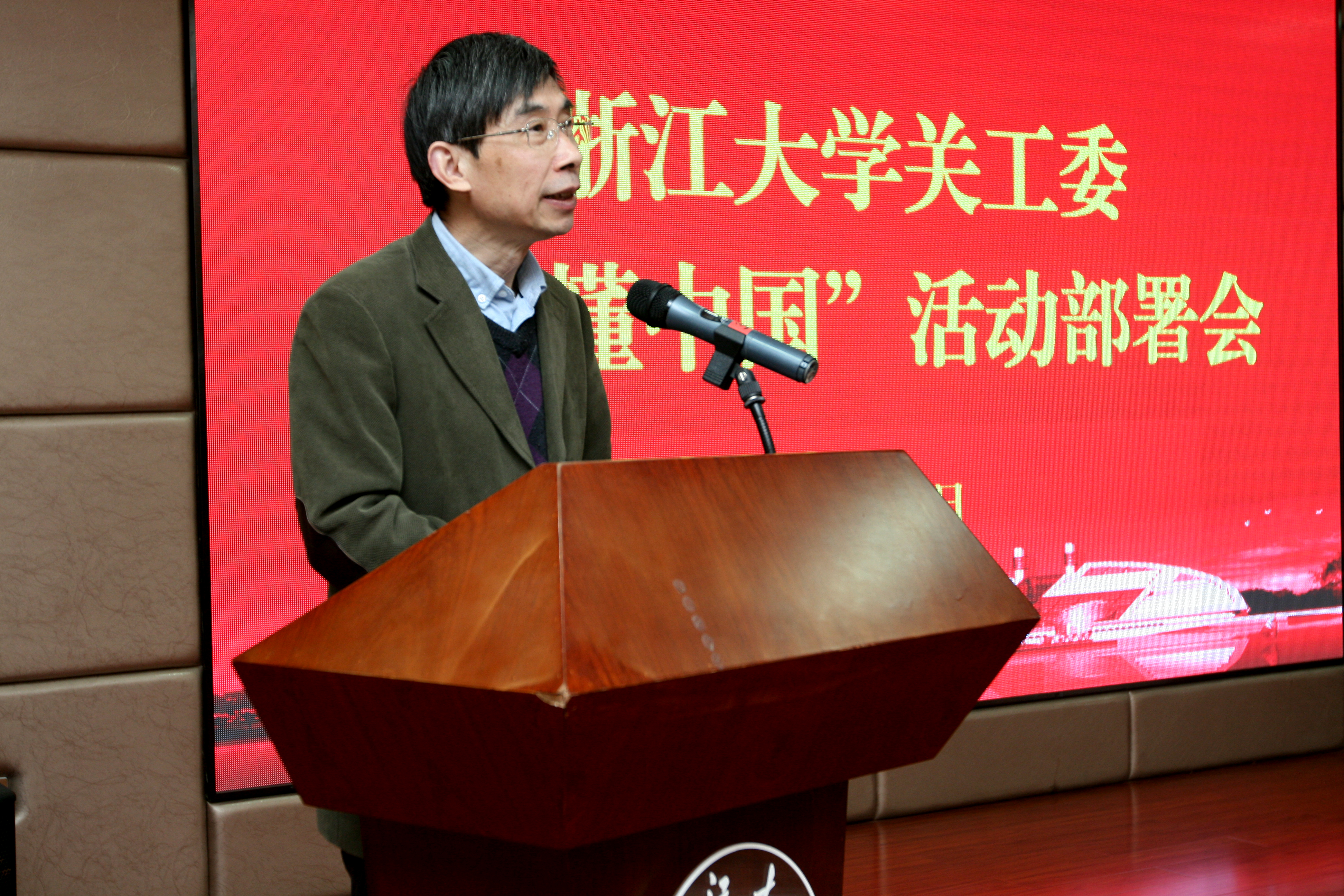 浙江大学党委原副书记、校关工委顾问郑造桓在讲话中指出,“读懂中国”和“在鲜红的党旗下”是有机的整体。“读懂中国”,首先要读懂中国的历史,读懂近现代的心酸历史。他从1840年鸦片战争讲到1949年新中国成立的艰苦卓绝的伟大历程,鼓励青年一代要学习了解历史中值得纪念的事件并深切感悟中国共产党的历史担当和时代使命。同时还要读懂浙大的校史,浙大的校史是中国历史的缩影,要通过这次“读懂中国”活动,让学生更多地了解国史、校史,使他们有所感悟,有所收获。