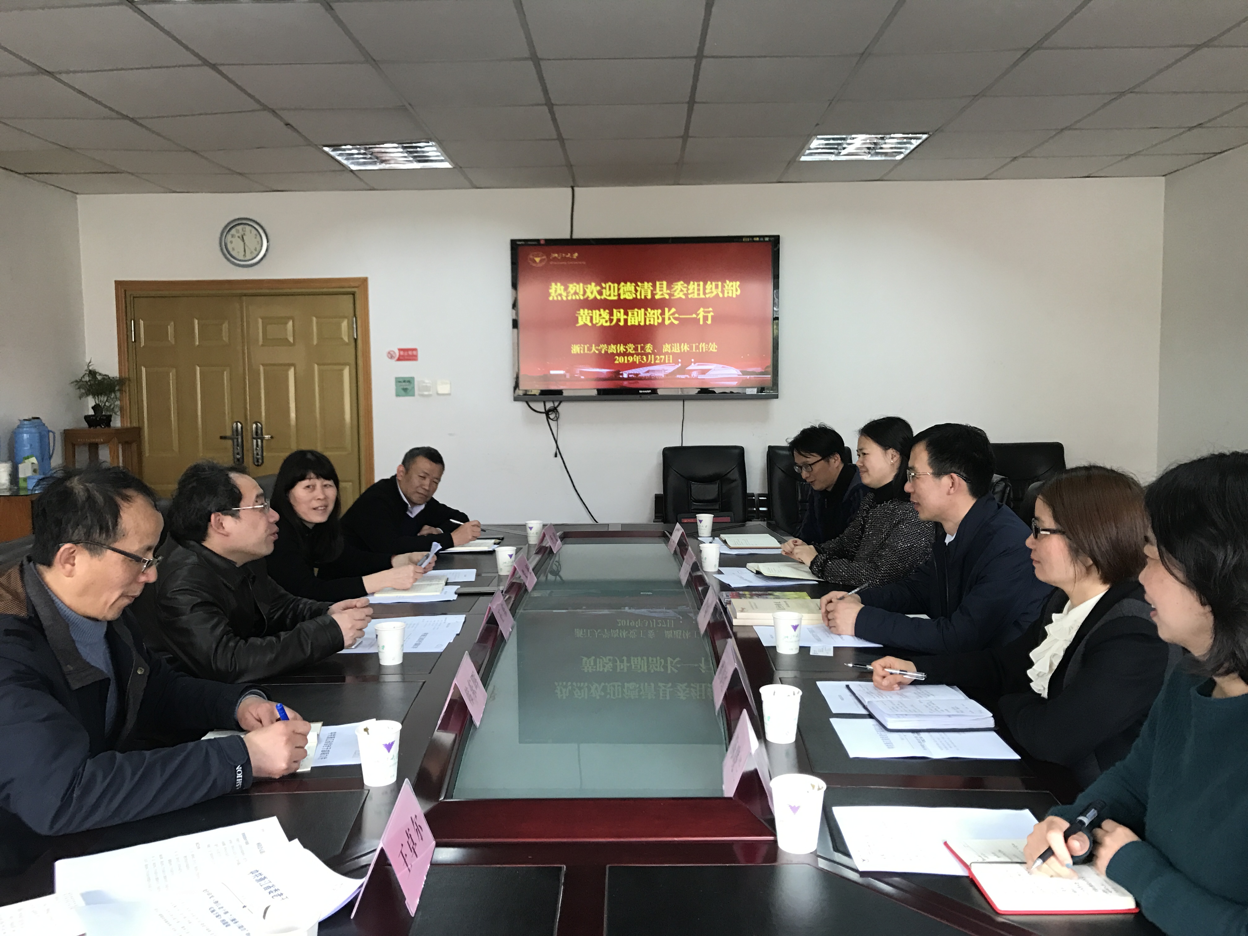 3月27日上午,德清县委组织部副部长、老干部局局长黄晓丹一行5人到我处调研,并就进一步加强校地合作,深入开展“三服务三助力”活动合作事宜进行座谈交流。处领导王东、朱征、韩东晖、李民参加了座谈会。