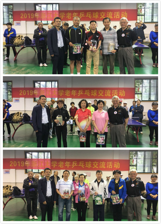 4月26日上午,2019年浙江大学老年乒乓球交流活动在华家池校区乒乓球馆圆满举行。本次交流活动设男子单打、女子单打、男女混合双打三个项目,吸引了来自玉泉、西溪、华家池、湖滨、紫金港五支参赛队30余位乒乓球爱好者积极参与。离退休工作处副处长王剑忠、李民出席本次交流活动并为优秀运动员颁发奖品。活动由浙大老年体协华家池分会主席金中仁主持。
