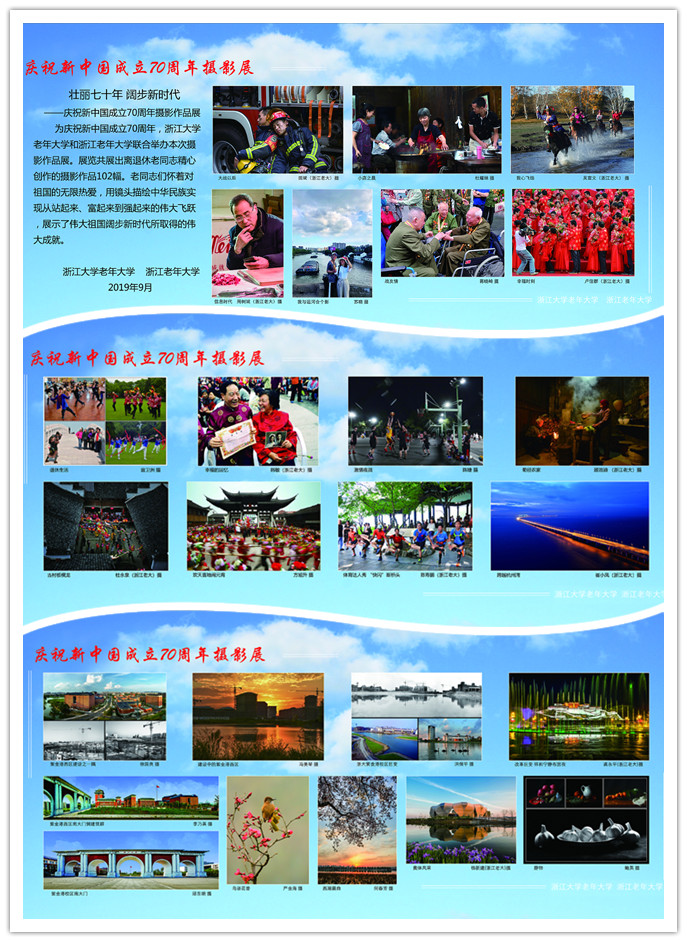 丹桂香、花潮涌、启真湖畔齐聚首。9月12日,浙江大学老年大学和浙江老年大学联合举办的“壮丽七十年 阔步新时代”庆祝新中国成立70周年摄影作品展在浙江大学紫金港校区文化广场隆重开幕。浙江老年大学甄柏钧主任一行,浙江大学老年大学校长林荣堂、副校长方旭升,我校离退休工作处有关领导以及参展作品作者代表共30余人参加了这次开幕活动。