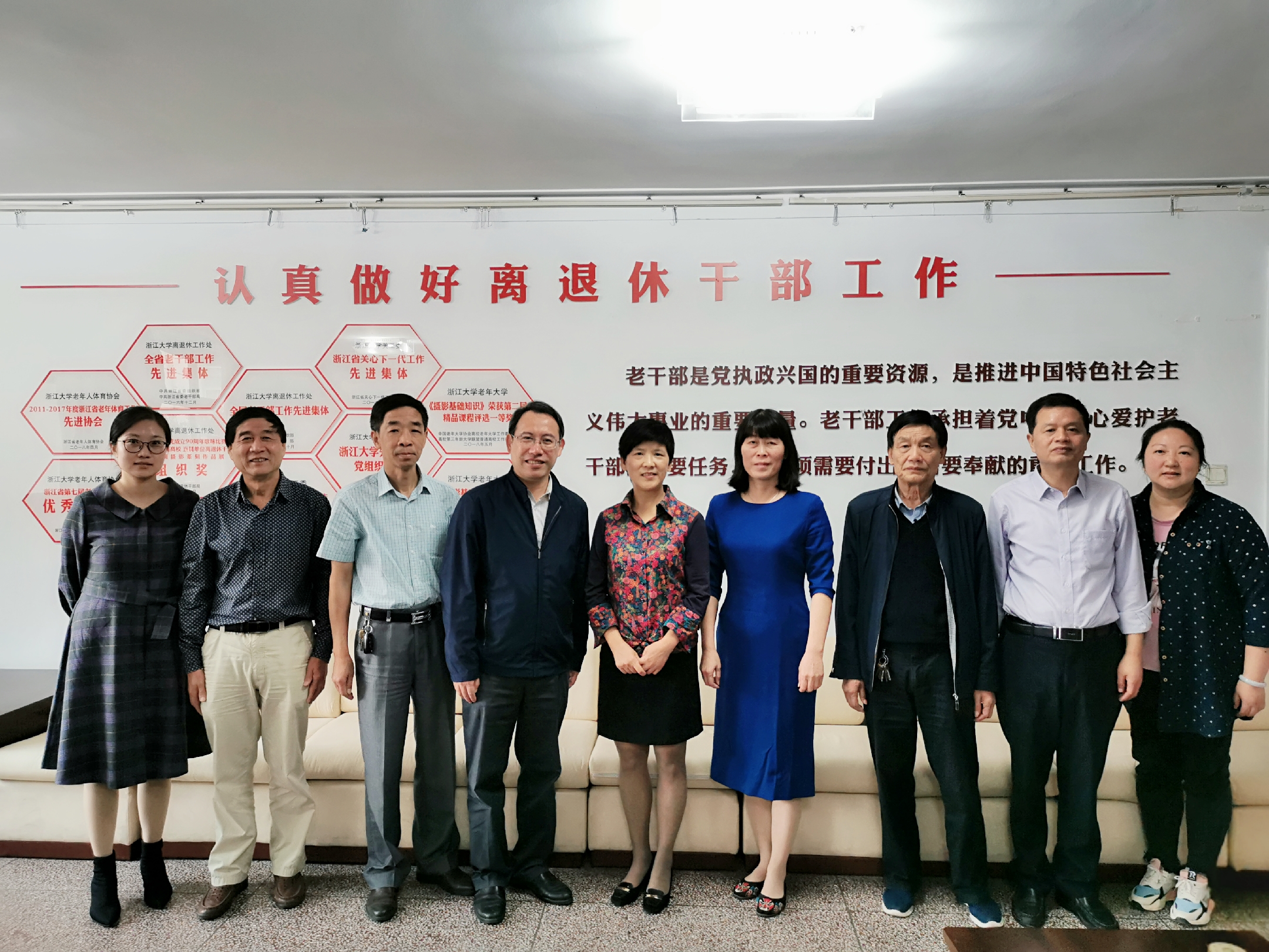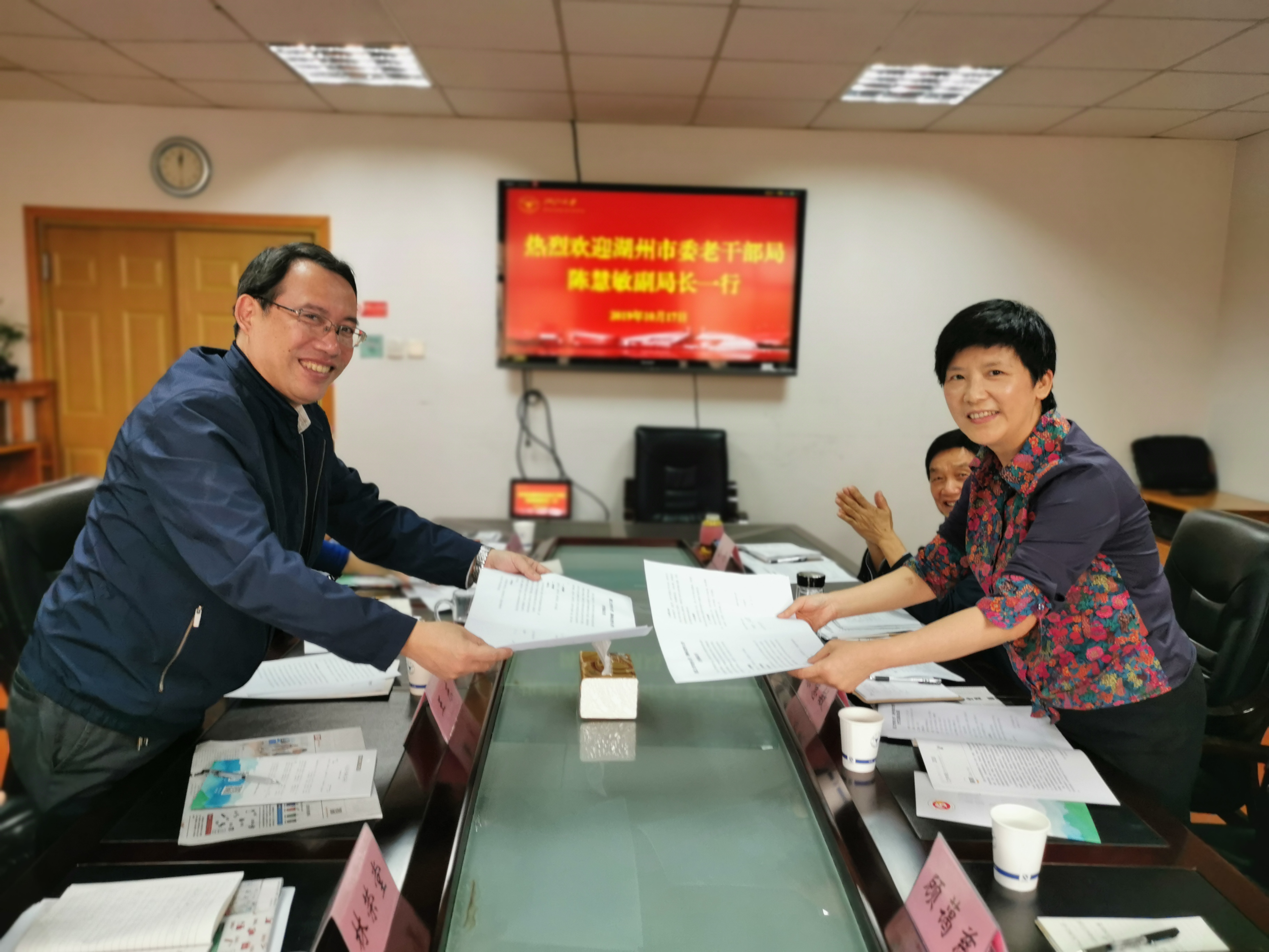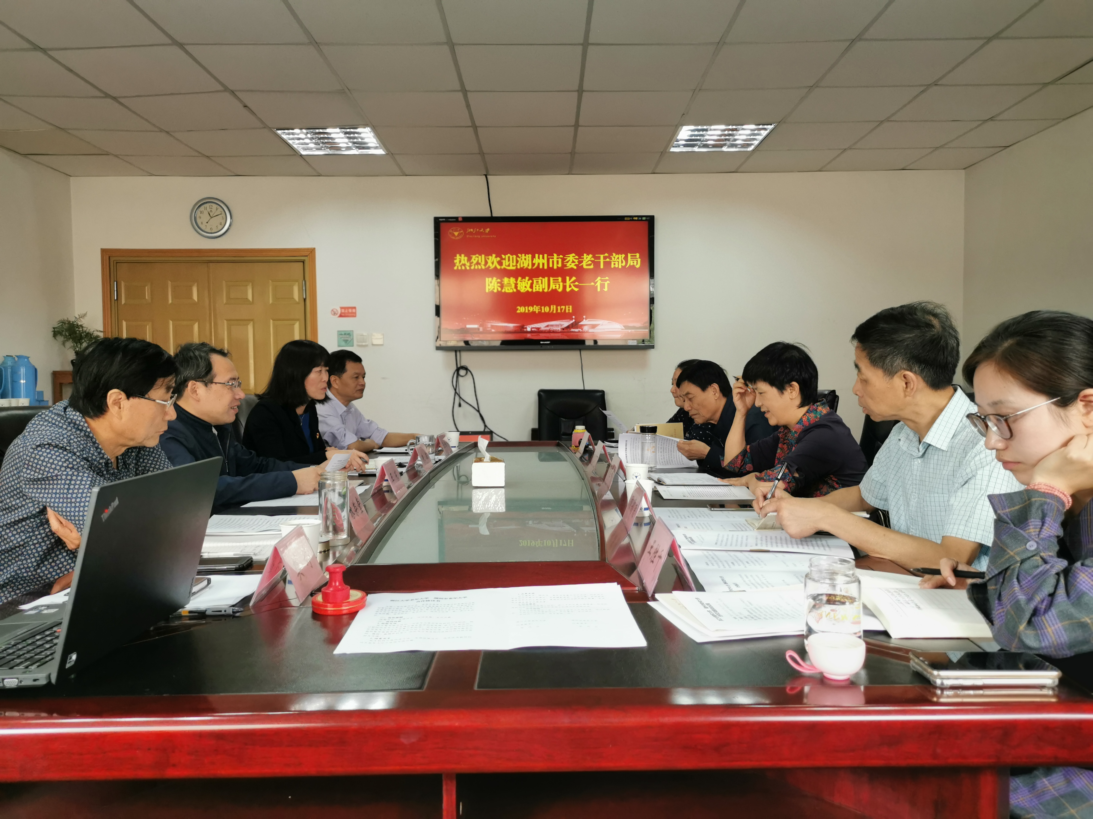 10月17日,湖州市委老干部局副局长、老年大学副校长陈慧敏一行5人到离退休工作处调研,双方就市校老年大学合作办学等具体事宜开展座谈,并签订了《浙江大学老年大学 湖州市老年大学合作协议书》。处领导王东、朱征、王剑忠及老年大学校长林荣堂出席了本次座谈会,会议由王剑忠主持。