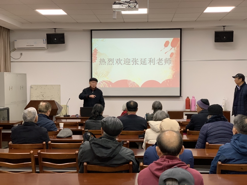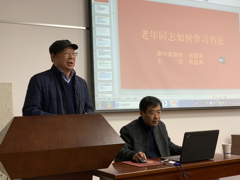 张延利老师从书法的传承与形势现状、老年人学书法是最佳选择、如何学习书法、学习书法应该把握的问题等方面进行了深入浅出的介绍。他说道,书法是无言的诗,无声的乐,虽然不是诗而有诗的韵味,不是画但有画的灵动,不是舞却有舞的飘逸,不是歌可有歌的悠扬。以书法相伴,可以修身养性,增长知识,提高品味,结交朋友,所以学习书法是老年人的一种最佳选择。