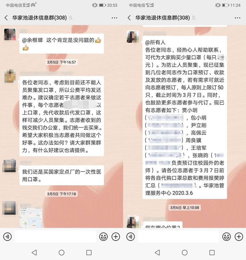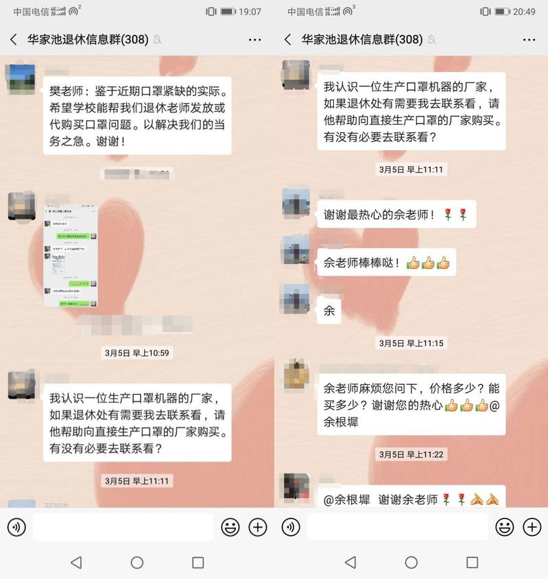 “家里只剩下一个口罩,必须出门配药了,这该怎么办才好呢?”“我一只口罩都没有,同事送我的十只口罩全家三人戴到今日,一只戴了半月之久”...疫情爆发以来,不少老同志都遇到了此类难题。3月5日清晨,一条条口罩急缺的求助信息在华家池退休信息群中闪烁。中心在职工作人员紧急商讨对策,依托现有信息交流发布平台,征集口罩采购各类信息渠道。原浙农大设备处处长、82岁高龄的余根墀老师看到信息后,马上联系他认识的一个生产口罩机器的厂家。群里的老同志纷纷提问,一个口罩价格多少?有没有现货?多长时间能够到货?大家兴奋地讨论和期待着…