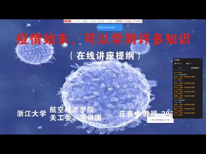 2020年4月10日,一场别具风格的主题为“在鲜红党旗下——疫情始末,可以学到许多知识”的在线党课在玉泉教五212会议室举行。下午一点半,86岁高龄的浙江大学关工委宣讲团成员、航空航天学院退休教师庄表中教授便已出现在直播会议室,为即将进行的线上党课做充足准备。此次活动由学院团委副书记王晓民老师主持,历程约一个半小时,学院全体党员、预备党员及入党积极分子共计260余人参加。
