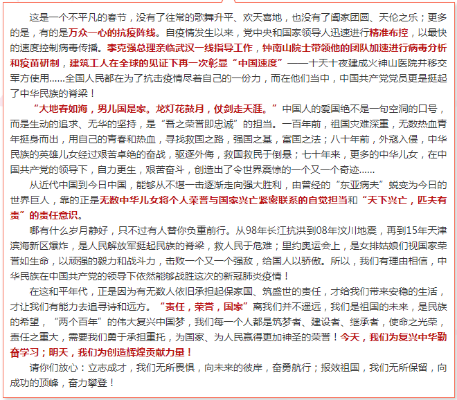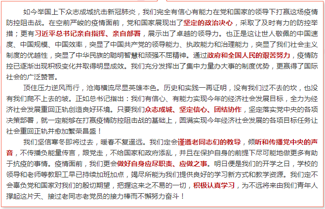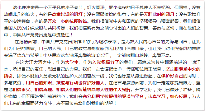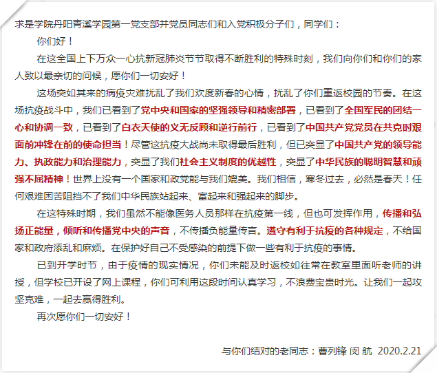 在全民抗疫的特殊时期,丹青学园第一党支部于2020年2月21日召开了线上党员大会,传达落实疫情期间党建工作要求,布置落实特殊时期党支部工作。在这个特殊的时期,党支部结对关工委老同志曹列锋老师、闵航老师寄语第一党支部的党员、入党积极分子和同学们。